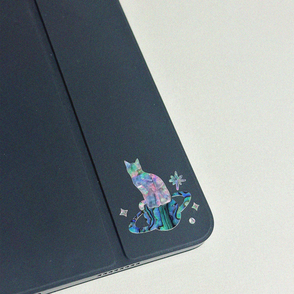 Take your style out of this world with Hanott's attachable najeonchilgi (Korean lacquerware) sticker, featuring an enchanting design of a cat sitting atop a planet. Crafted from iridescent mother-of-pearl inlay, this 40 x 40mm sticker merges traditional Korean craftsmanship with a touch of interstellar charm. Perfect for personalizing smooth surfaces like laptops, journals, or keepsakes.