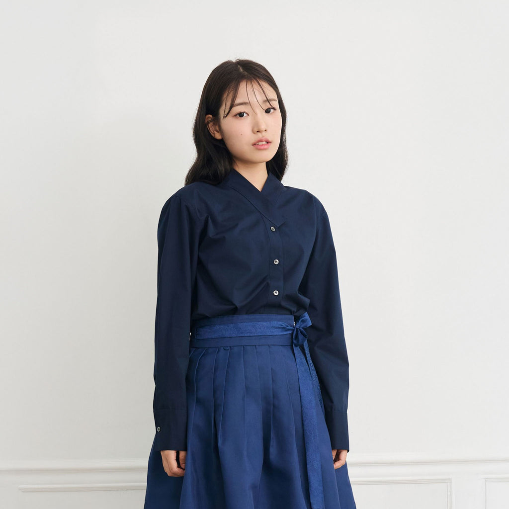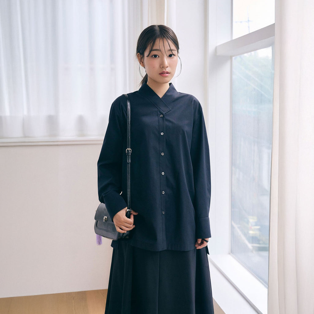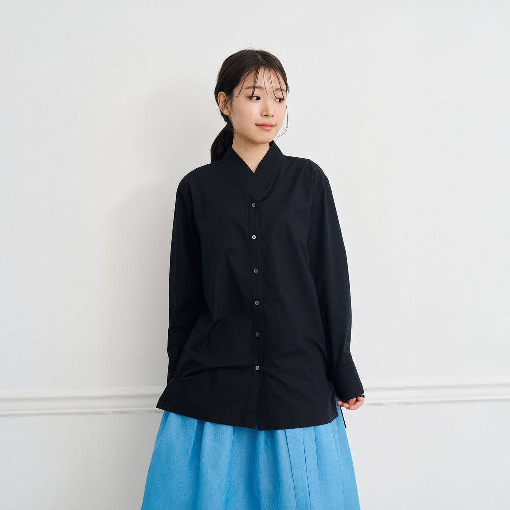 With a long silhouette that covers the hips, this shirt pairs effortlessly with jeans, skirts, or even traditional Hanbok skirts for a modern-meets-traditional look. -