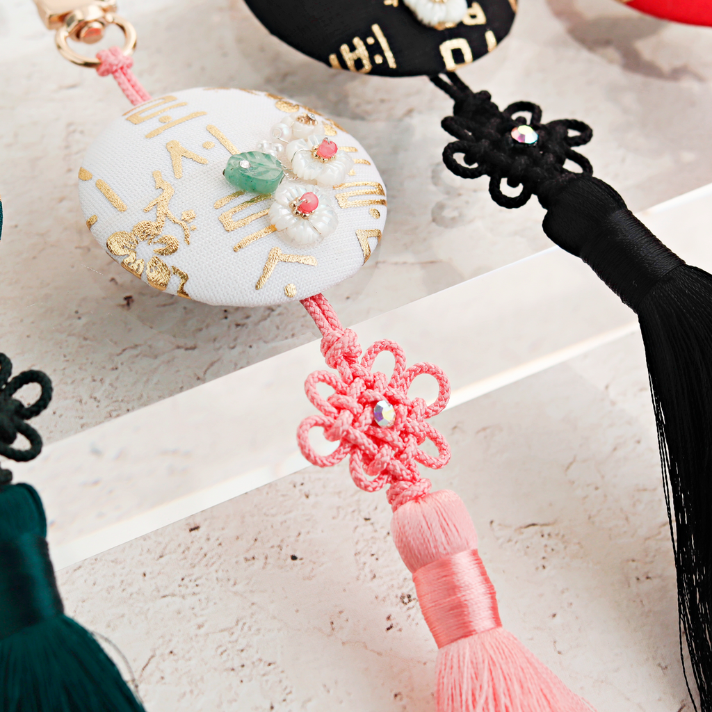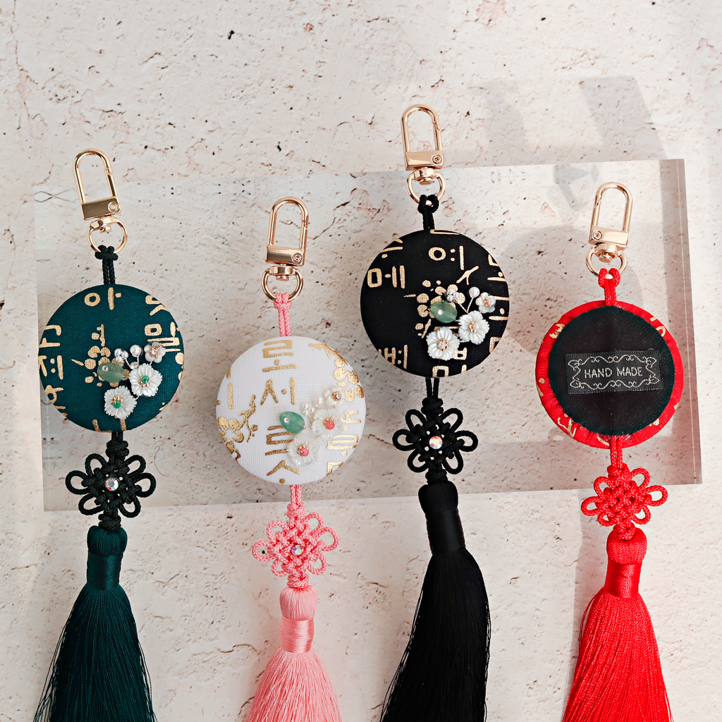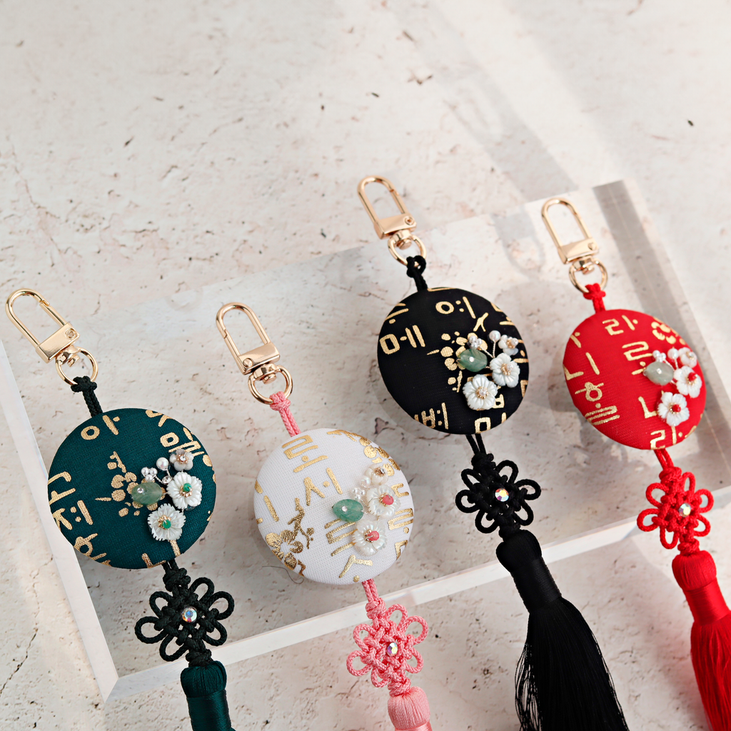This elegant key ring combines embroidered hanbok fabric with a mother-of-pearl flower and jade leaves, all beautifully woven with wire. It’s versatile for use as a bag charm, key ring, or traditional norigae. Choose from black, white, red, or green colors.