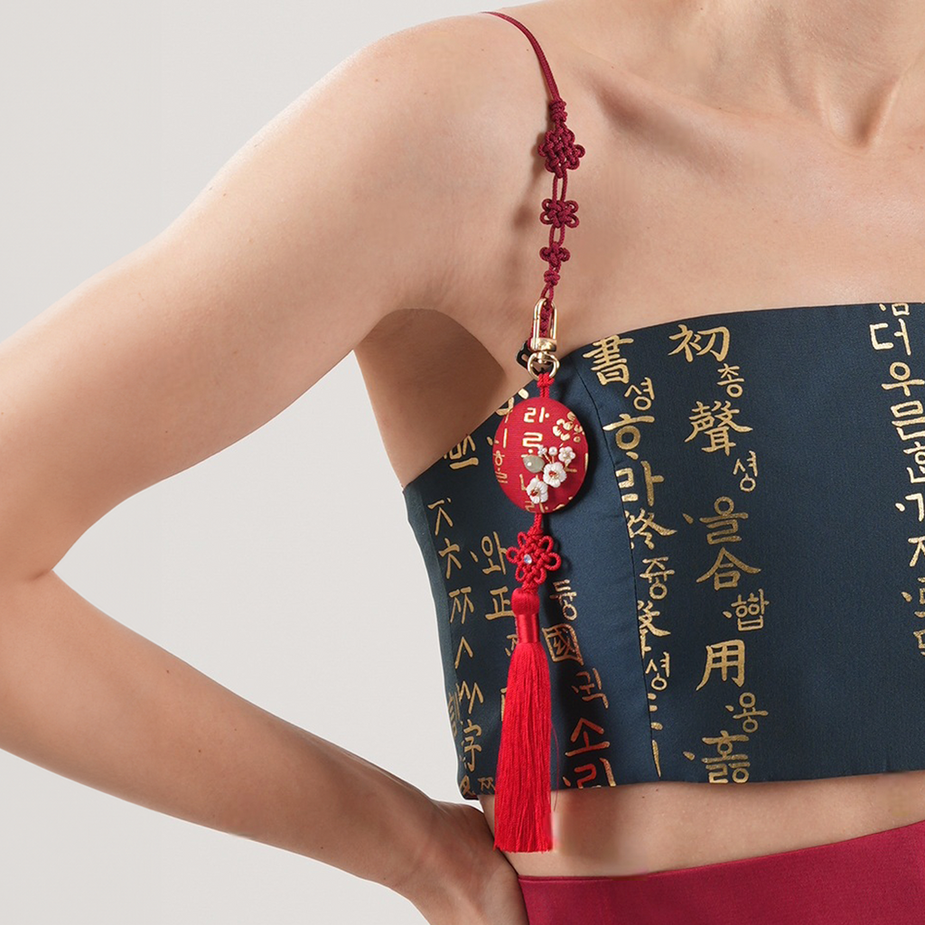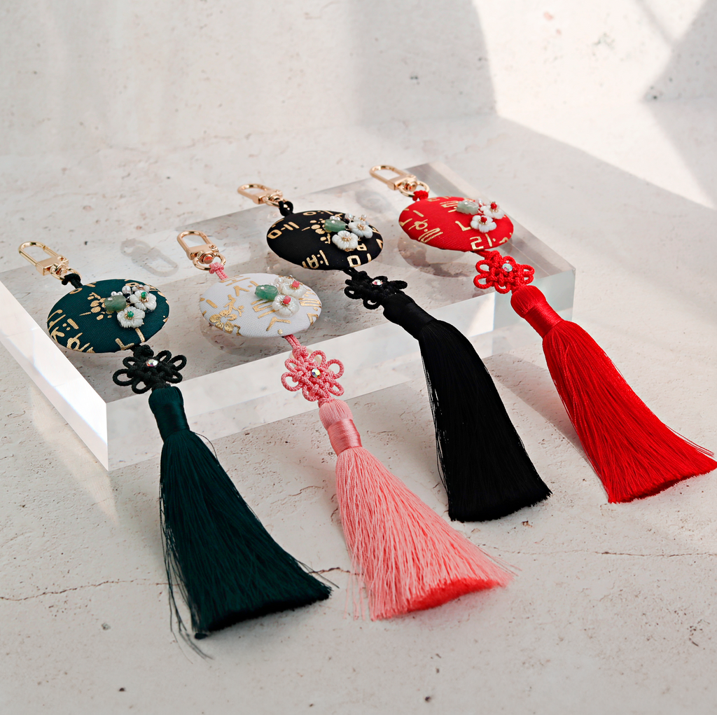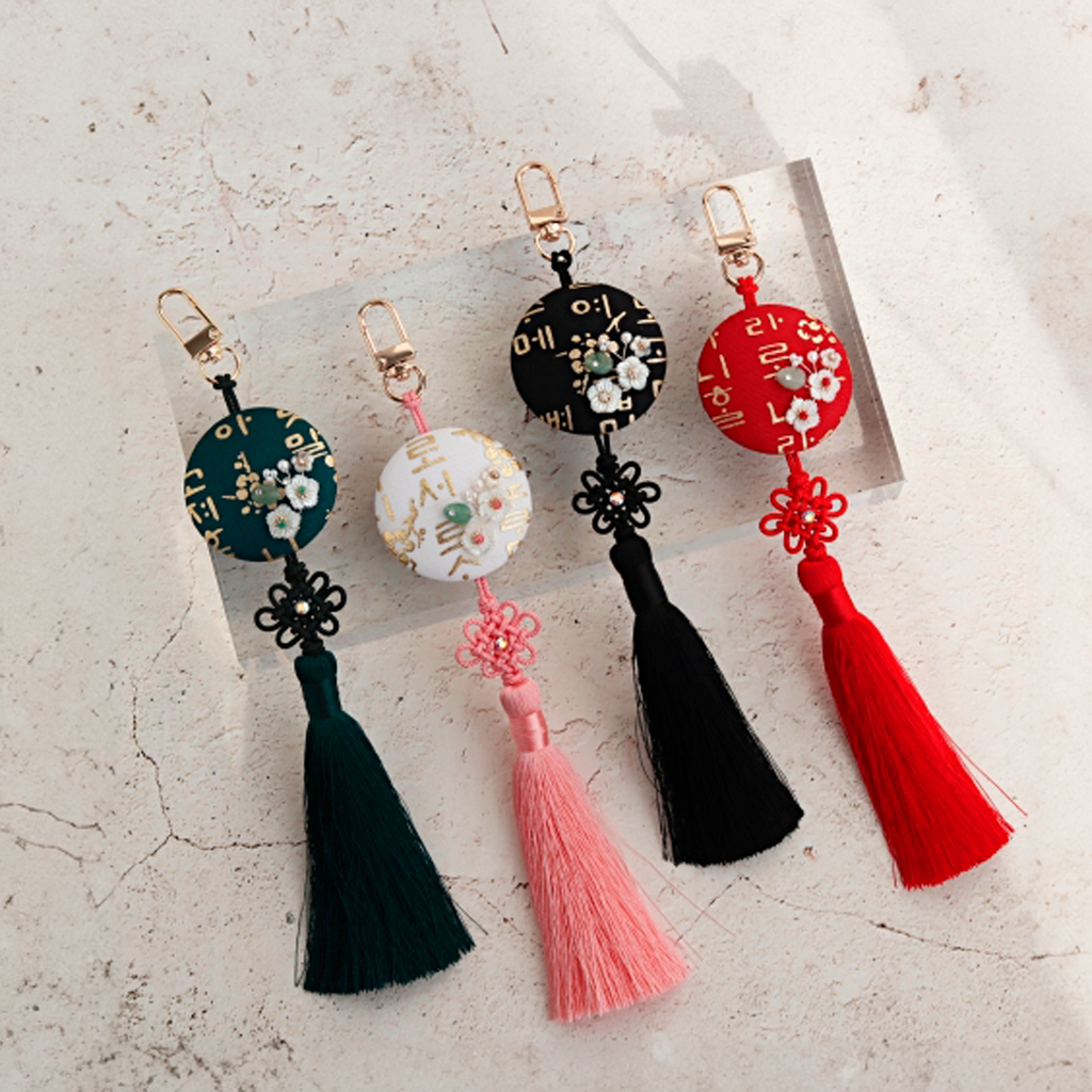 This elegant key ring combines embroidered hanbok fabric with a mother-of-pearl flower and jade leaves, all beautifully woven with wire. It’s versatile for use as a bag charm, key ring, or traditional norigae. Choose from black, white, red, or green colors.