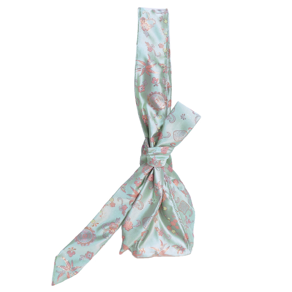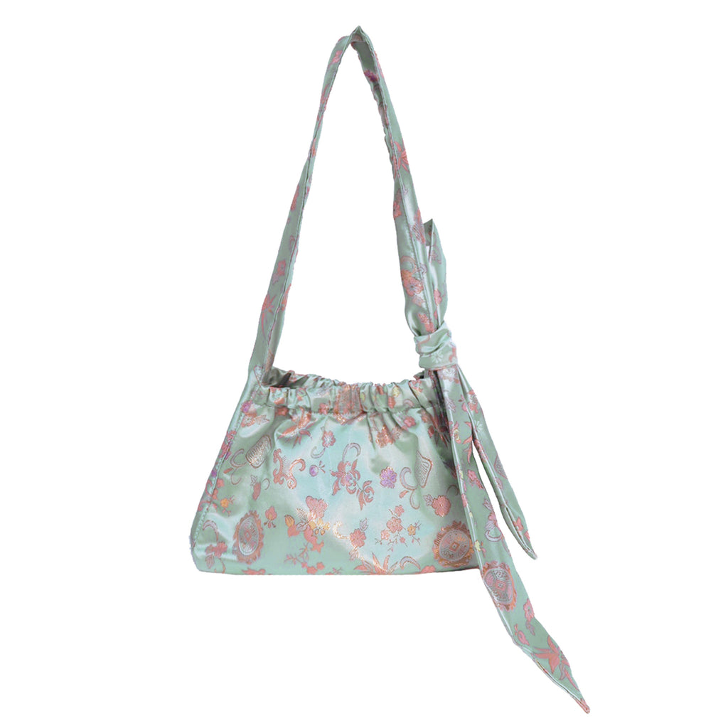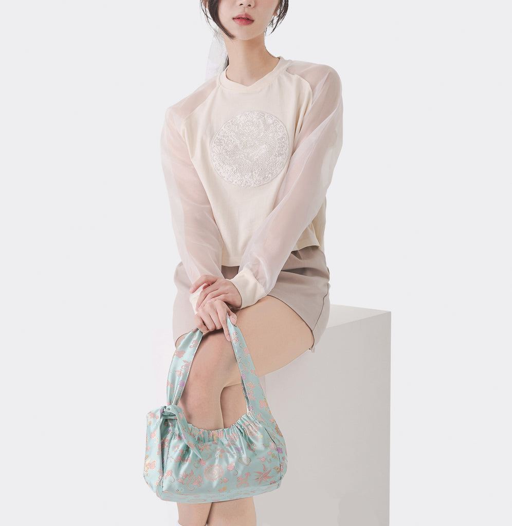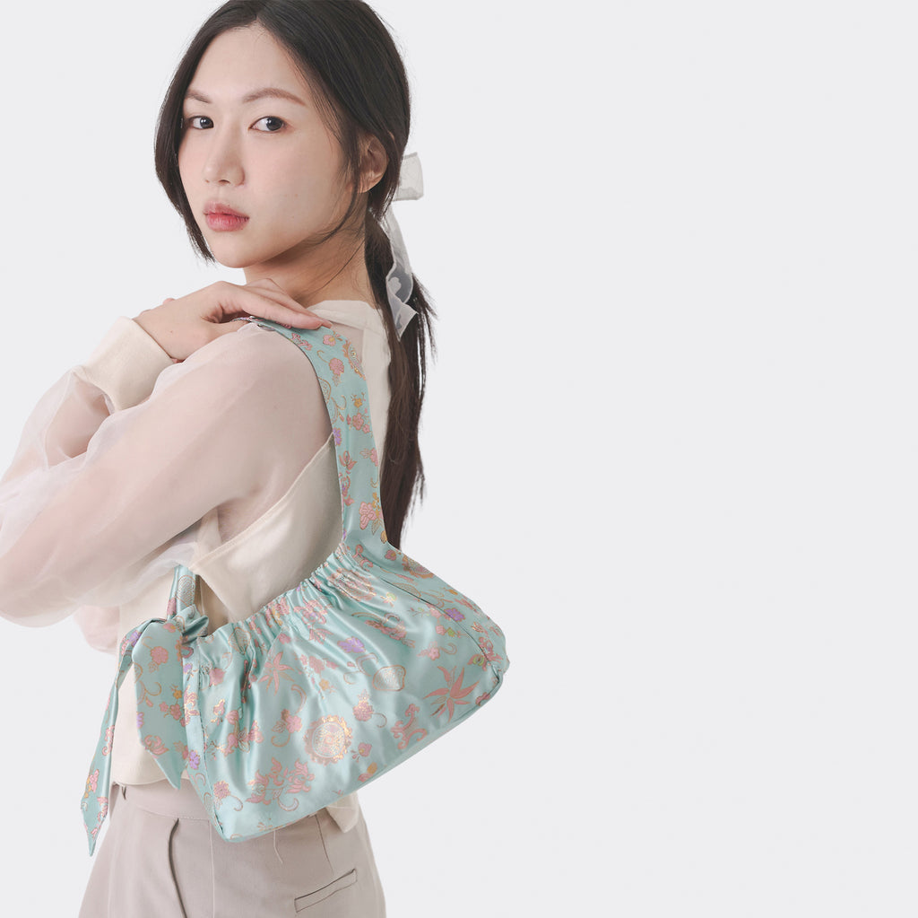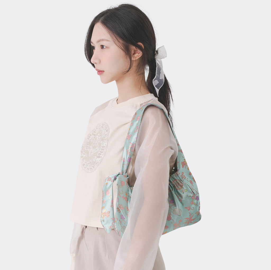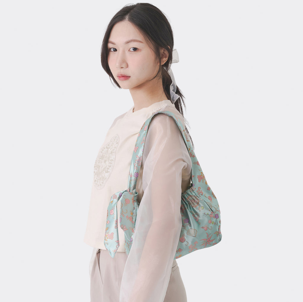 This is Teeny Tiger's signature bag, crafted from luxurious mint-colored hanbok fabric that features traditional Korean patterns in matte embroidery.