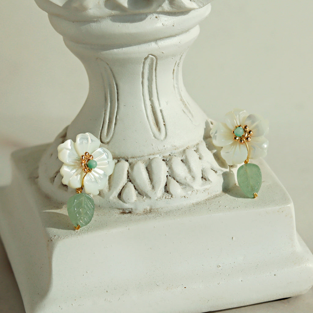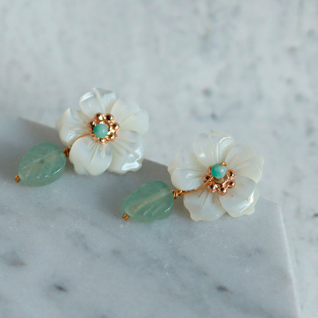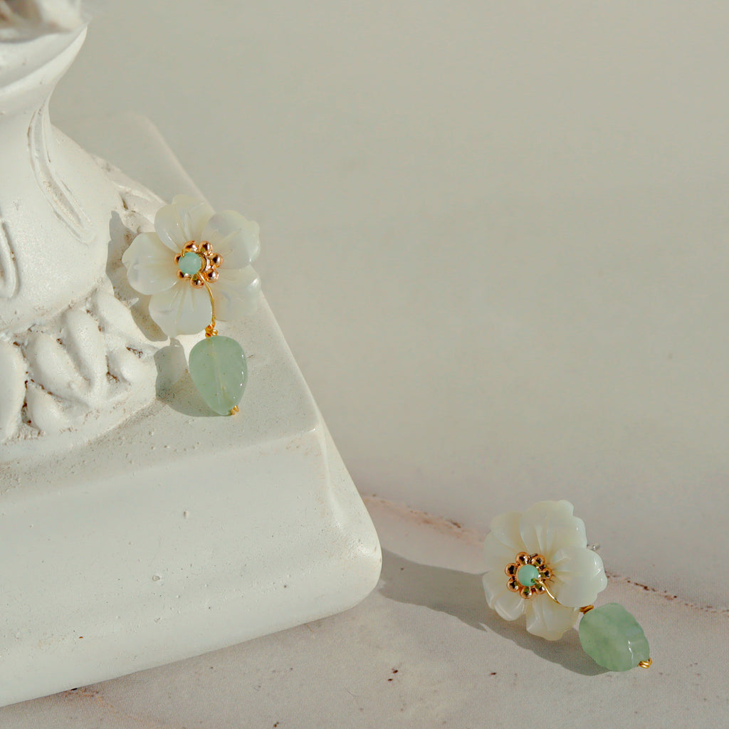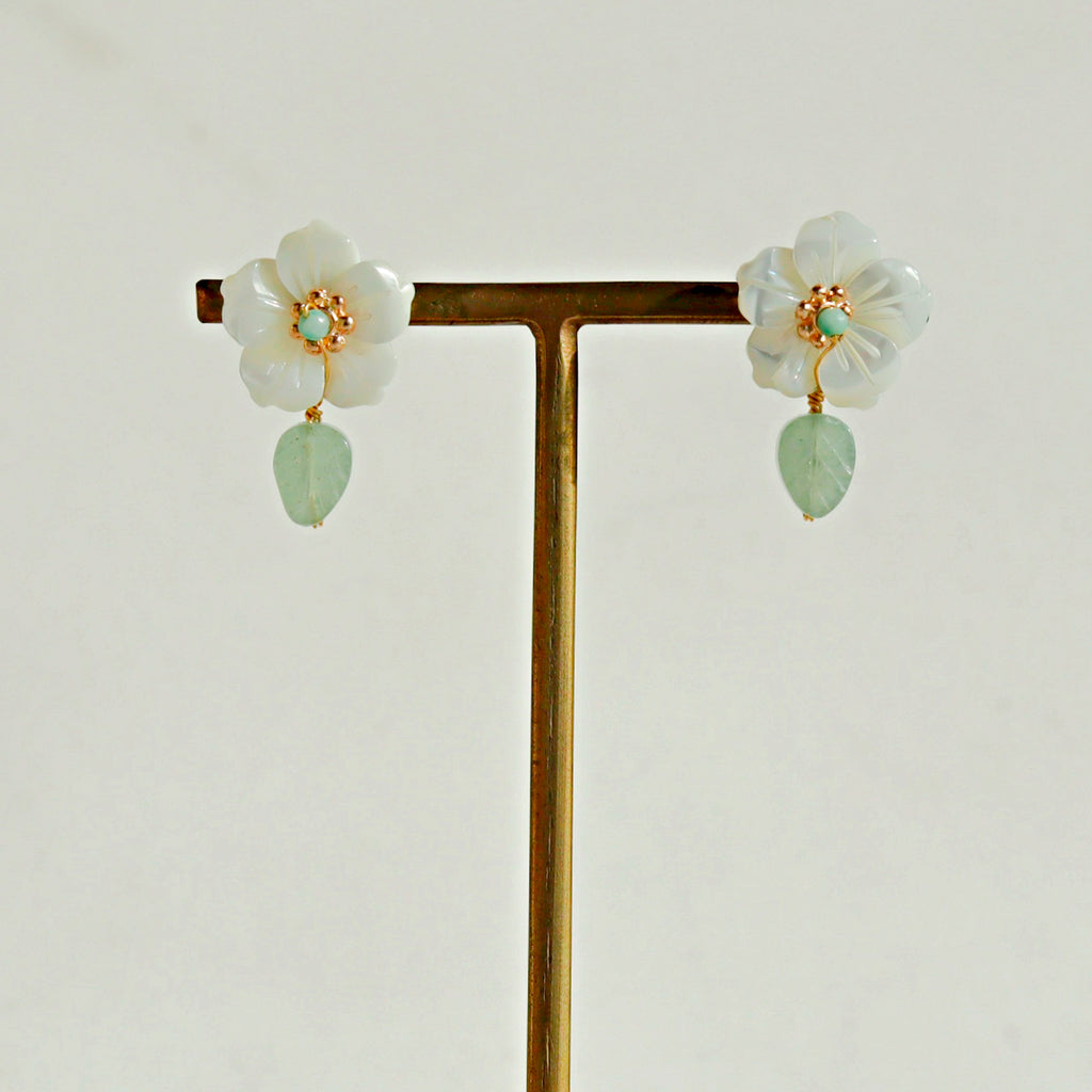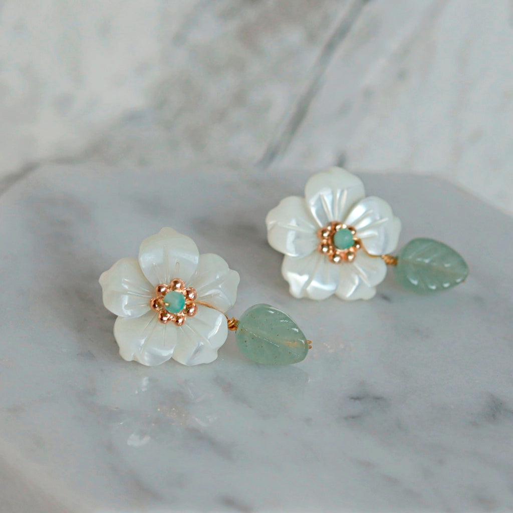 These earrings feature jade leaves, a green gemstone, paired with delicate mother-of-pearl flower petals. The pieces are carefully wrapped together with gold wire. The white petals, made from processed seashells, bring a refreshing touch, especially in the summer.